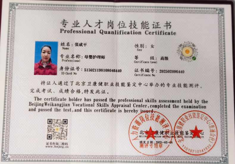 来自四川省蓬安县。性格开朗,讲卫生,热爱生活,能吃苦,尊老爱幼,有礼貌,喜欢宝宝,对宝宝有爱心和责任心。育有两个儿子,大宝20岁,二宝15岁。经过专业的培训,掌握了科学的护理知识,具备护理0-1岁宝宝的经验,能够根据宝宝的生长阶段进行不同的辅食添加,喜欢宝宝,通过肢体动作、被动操、抚触按摩等方式对宝宝进行启蒙教育。